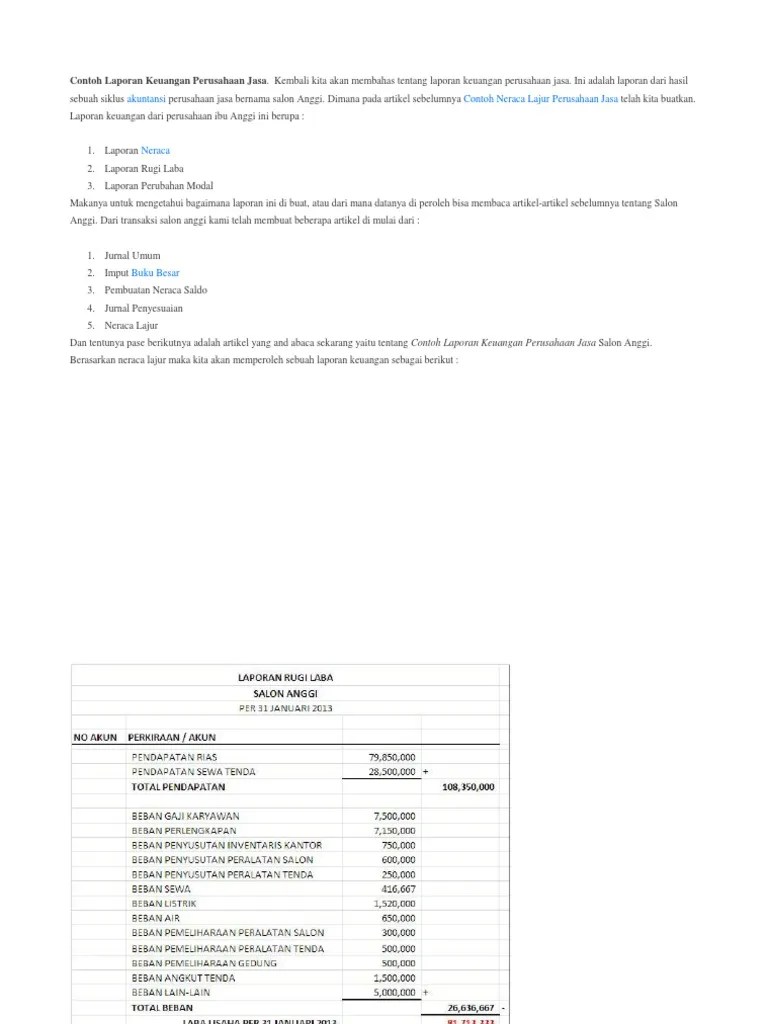 Contoh Laporan Keuangan Perusahaan Jasa Pemeliharaan Tanaman - 2 : Jasa akuntansi, pembukuan, dan atestasi laporan keuangan; .. Penghasilan yang dibayarkan kepada badan usaha atas jasa keuangan . Beban operasi, pemeliharaan dan jasa telekomunikasi. Laporan laba rugi dan penghasilan komprehensif lain konsolidasian. Akuntansi pemerintahan adalah sebuah kegiatan jasa dalam rangka menyediakan informasi. Biaya pemeliharaan dan perbaikan dibebankan langsung ke laporan laba rugi konsolidasian pada saat terjadinya.